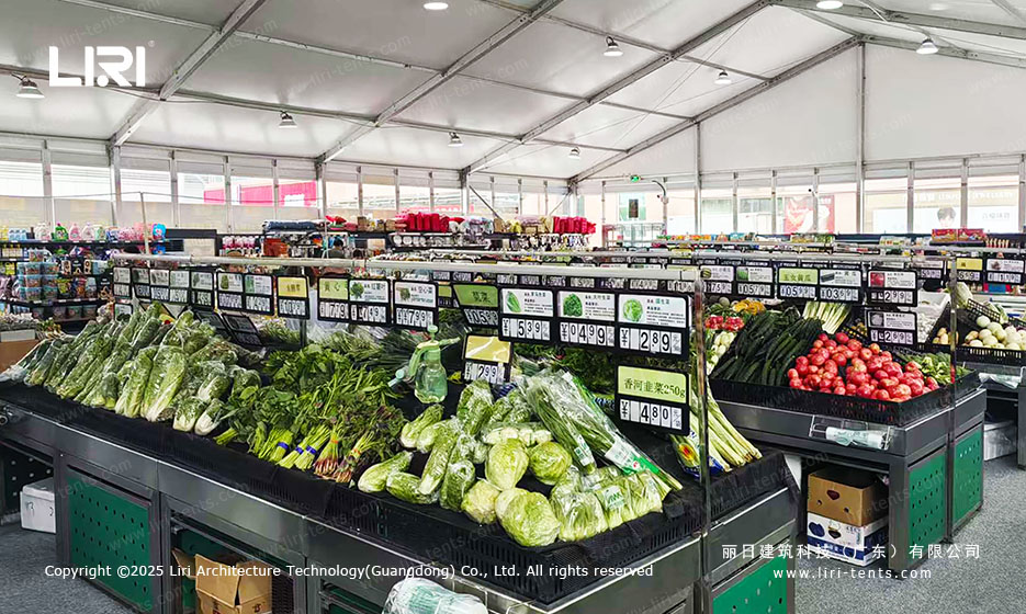 - Low Operational Interruption Risk: Custom tent fabrics (such as PVC fabric) offer excellent waterproofing, UV resistance, and flame retardancy, ensuring the supermarket can operate normally in various weather conditions.
