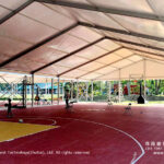 Our basketball game tents can be customised to suit the size of the venue, with a maximum span of up to 60 metres and unlimited extension, and can be fitted with a sliding transparent PVC curtain wall on the inside to provide protection from the wind and rain while maintaining air circulation. Compared to traditional outdoor basketball courts, our tents offer a bright indoor sports environment with a unique lighting system and a floor that meets the requirements of professional events.