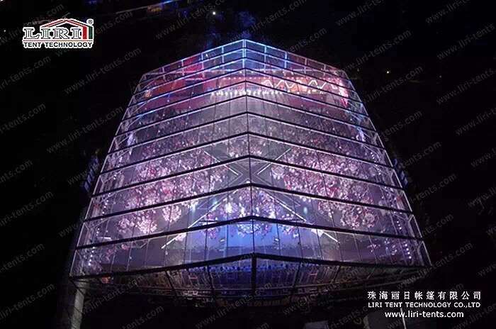 Recently, we have installed a 50m clear span tent with transparent rooftop and the glass walls, added some different lighting system, it looks great. Our LH series tent, size from 30m-60m, main profile size is 350x120x5mm. The modular design enables the tent to increase or decrease its length by 5m bay basis. Full-line accessories are compatible with this series. Customized design is available. At the moment, this tent is the largest transparent tent in China.