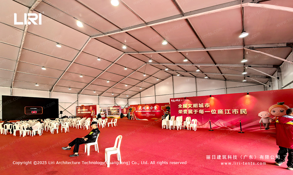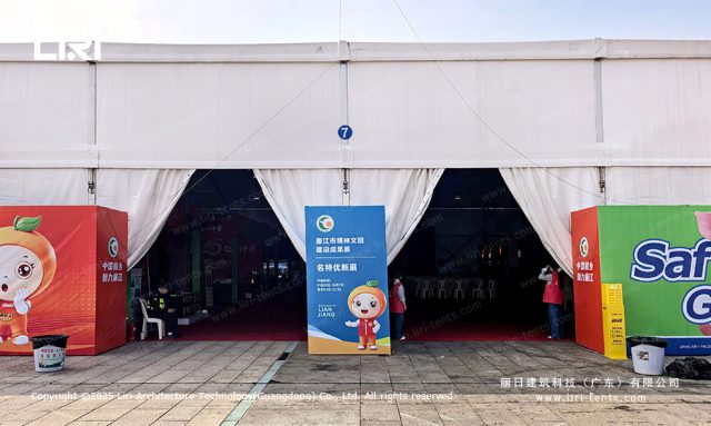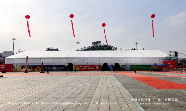 The true versatility of an event tent for sale in this context lies in its “Lego-like” adaptability. For the registration areas, we utilized integrated glass walling to create a professional first impression. In the catering section, specialized ventilation gables managed airflow. This project proves that a single structural system can meet the disparate requirements of a high-traffic public event without compromising on safety or aesthetic appeal.
