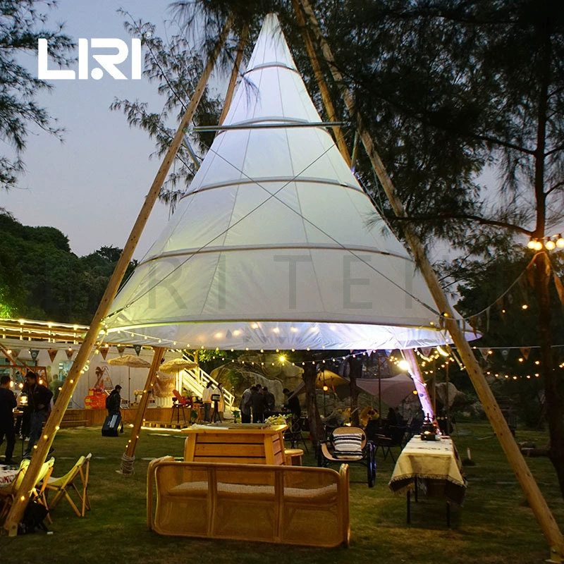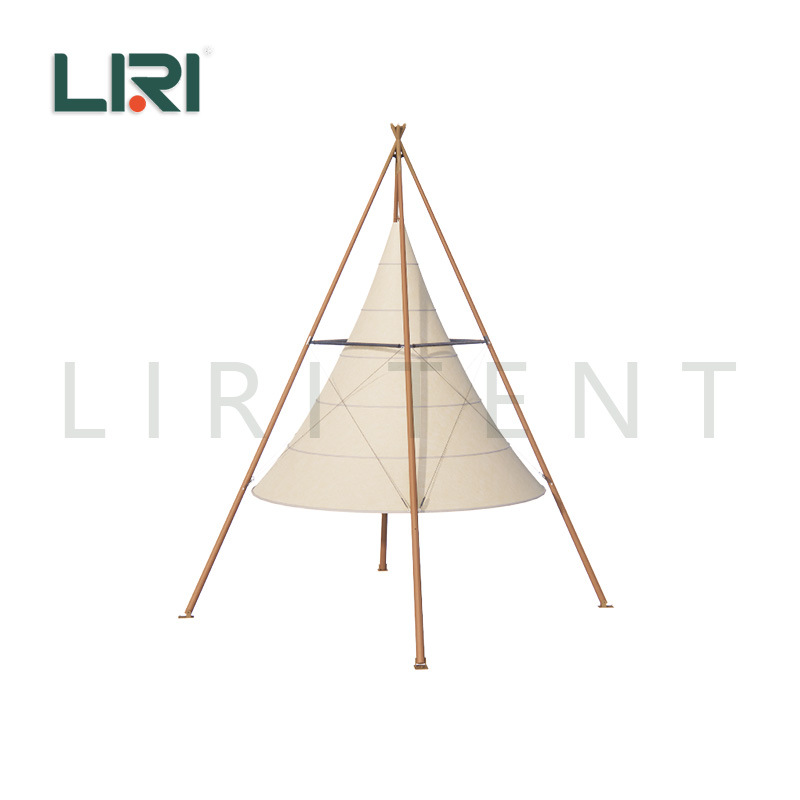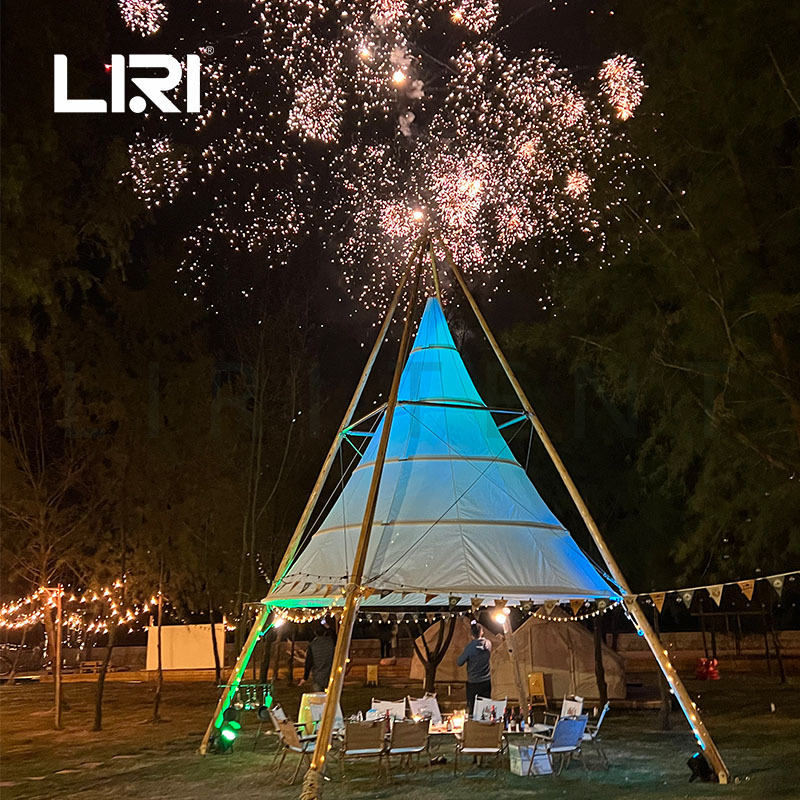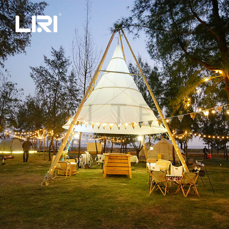 Liri Tent’s bamboo tipi tent creates a unique beauty through the combination of circles and triangles. The original conical fir pole adopts high-quality and complete fir, and the natural conical shape is more in line with the pyramid design principle, which can better shape the overall image; The white high-density waterproof and breathable canvas has excellent sunscreen and flame retardance, more in line with the requirements of outdoor use, and has a long service life of weather aging resistance.