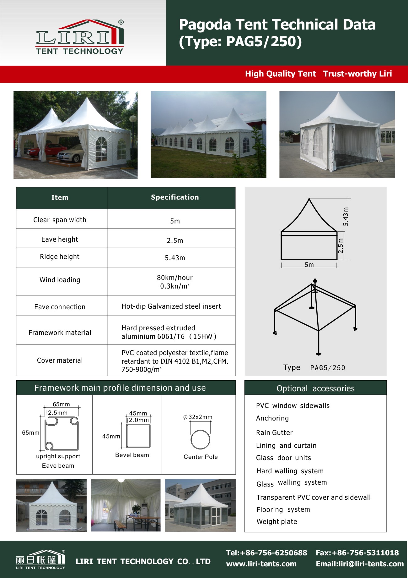 Among the different kind of tents, the Pagoda Tent must be the leading role which attract your eyes. The standard Pagoda Tent Series is available in 3x3m, 4x4m, 5x5m, 6x6m, 8x8m and 10x10m which with the high peak. It could be used as the single unit or combined to enlarge space and become a special structure style with a rain gutter.